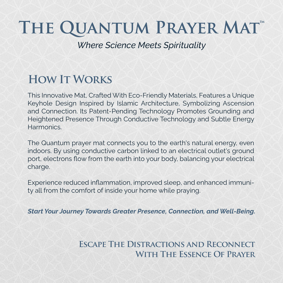 This innovative mat, made from eco-friendly materials, features a unique keyhole design inspired by Islamic architecture, symbolizing ascension and connection. Its patent-pending technology enhances grounding and presence through conductive technology and subtle energy harmonics, guiding you towards greater well-being.